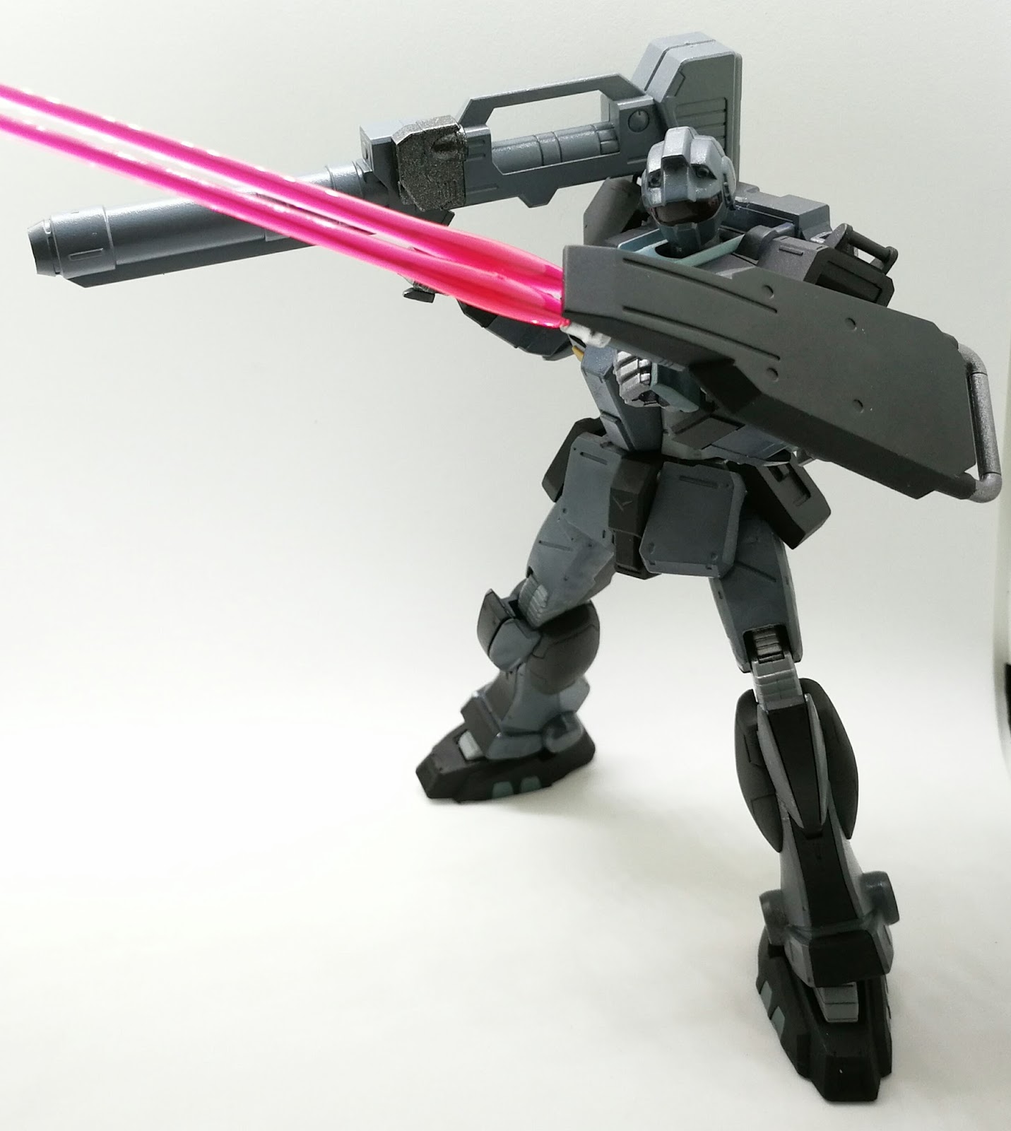 The standard-issue 100mm mobile suit machine gun is fitted with a high-capacity magazine to reduce the load from additional magazines of ammunition. Typically, a GM is able to complete its mission way before the 100-round magazine is depleted, saving time and effort on potentially fatal reloading drills. Although it takes more than a few rounds to penetrate Zeonic armour, the machine gun is usually used to provide screening and covering fire, diverting enemy attention away from the one of the most lethal weapons developed during the One Year War: the railcannon.