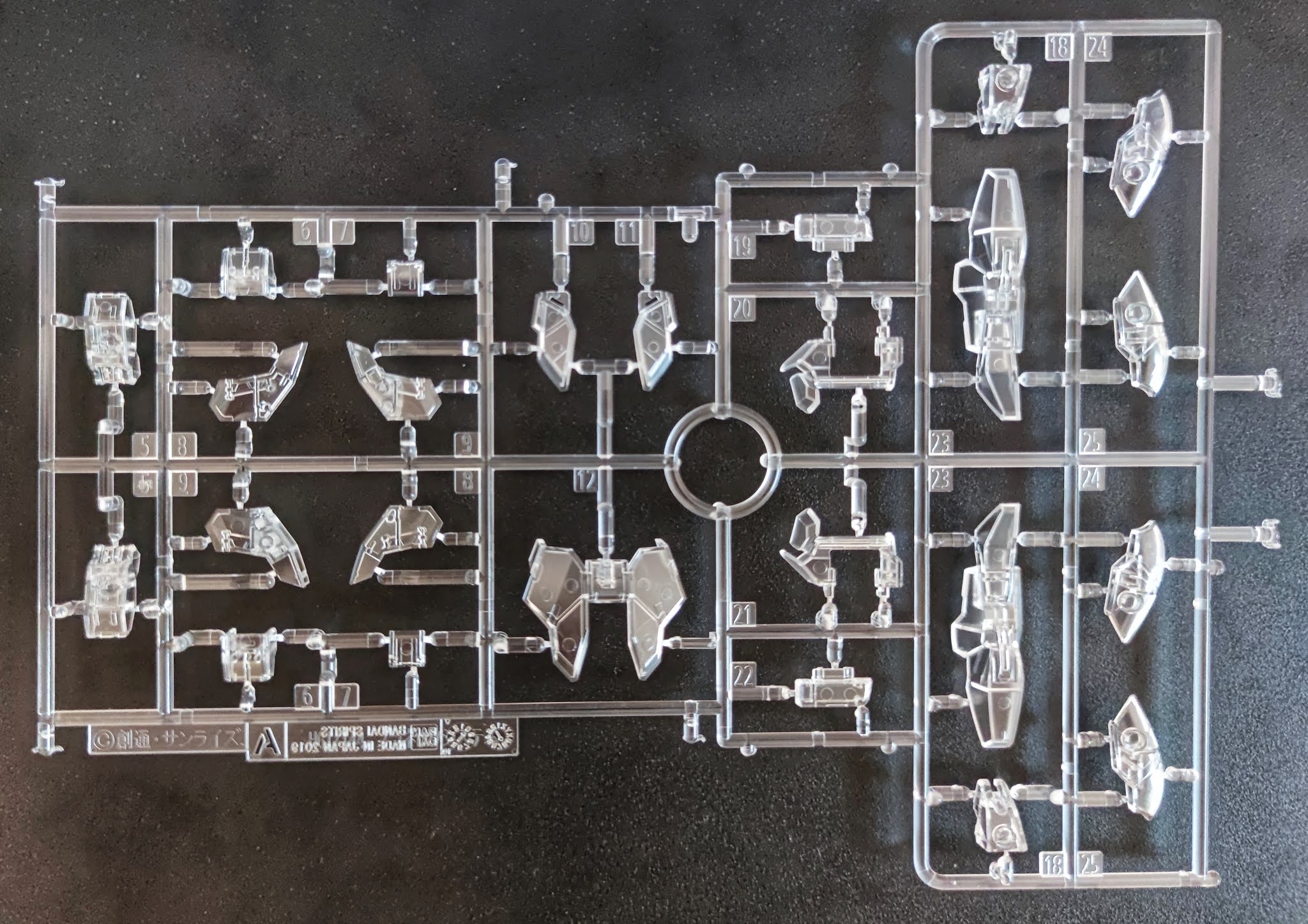 The model kit comes with a host of leftover parts diverted from previous releases, the chief offender being the almost complete set of Earthree Armor set in transparent plastic (Runner A).