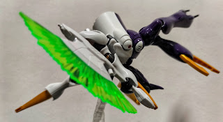 The somewhat ambidextrous design of the HGUC 1/144 Dictus allows for swapping of components to create a palette-mixed Dictus with the white and purple parts inverted. The Dictus' wide range of articulation and tight joints make it easy to achieve dynamic poses, although the spindly feet necessitate the usage of an action base for posing stability.